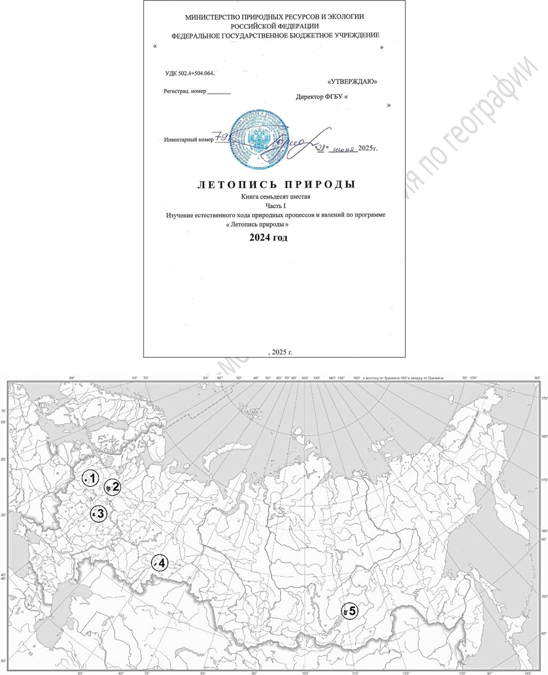 Ознакомьтесь с титульным листом единой формы ежегодного отчёта учреждений высшего ранга (Приложение А, рис.2.1), выполняющих особые задачи в пределах своих территорий. Пять из них показаны на карте (Приложение А, рис.2.2). По итогам их деятельности в 2024 г. было опубликовано 113 таких «Летописей природы»